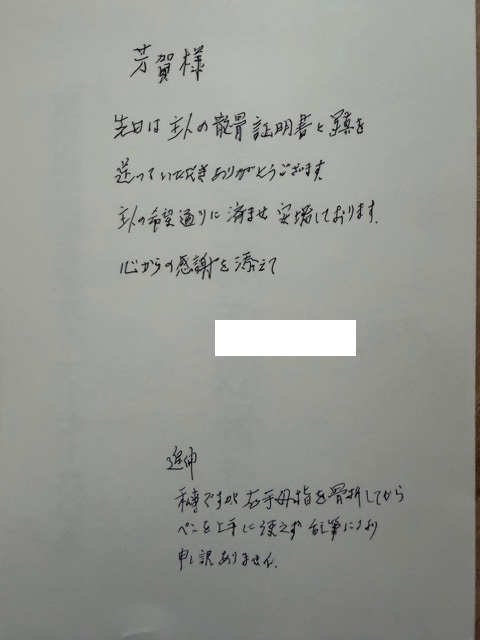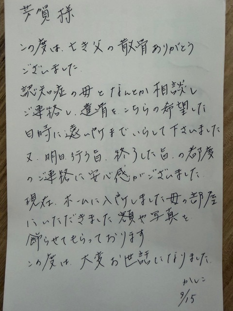 東京海洋散骨が行った散骨へのご感想の一部です。お客様の個人情報に関わる箇所は消しておりますがすべてリアルなご感想です。温かいお言葉、厳しいお言葉、すべてを受け止め今後も海洋散骨を選ばれる方のお役に立てるよう努力して参ります。このように海洋散骨を体験されたお客様の声、評判、口コミ、お叱りを公開することによりお客様が弊社の散骨にならずとも海洋散骨を知っていただくきっかけになれば幸いです。