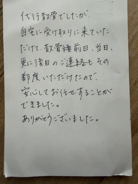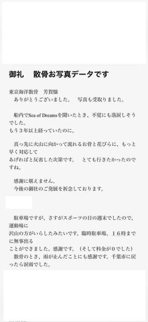 東京海洋散骨が行った散骨へのご感想の一部です。お客様の個人情報に関わる箇所は消しておりますがすべてリアルなご感想です。温かいお言葉、厳しいお言葉、すべてを受け止め今後も海洋散骨を選ばれる方のお役に立てるよう努力して参ります。このように海洋散骨を体験されたお客様の声、評判、口コミ、お叱りを公開することによりお客様が弊社の散骨にならずとも海洋散骨を知っていただくきっかけになれば幸いです。