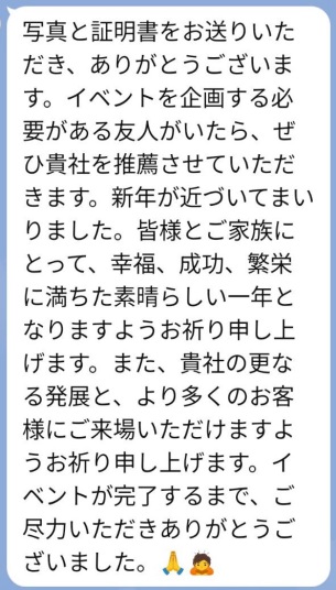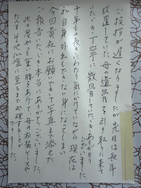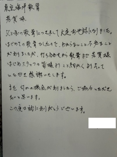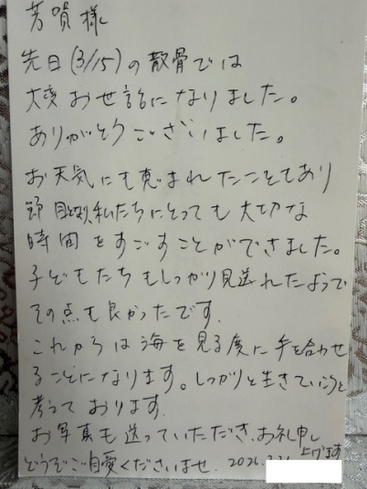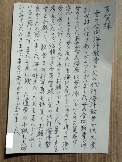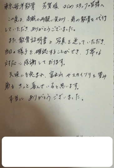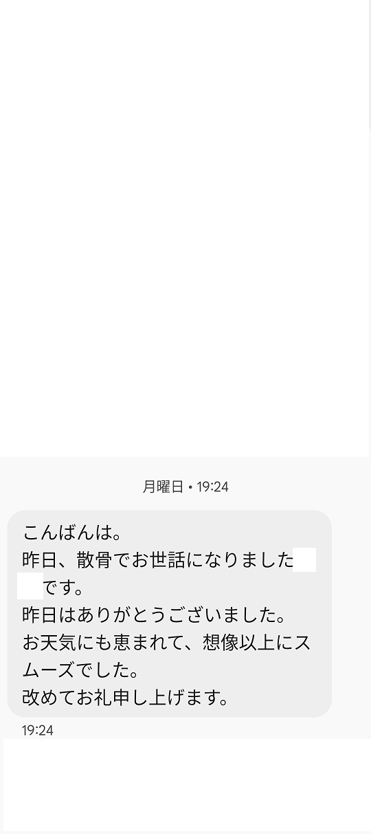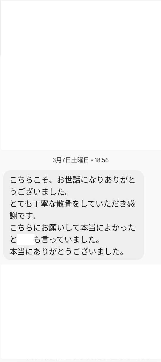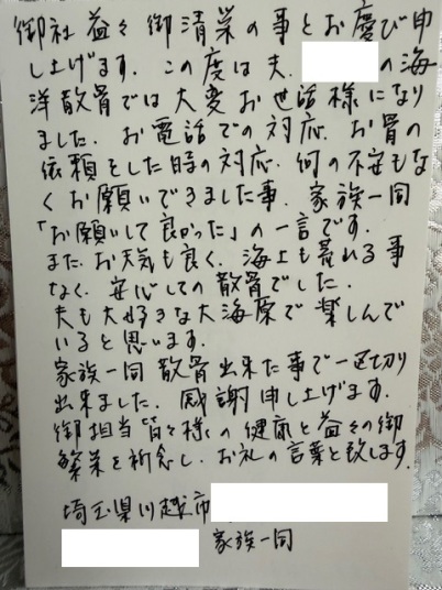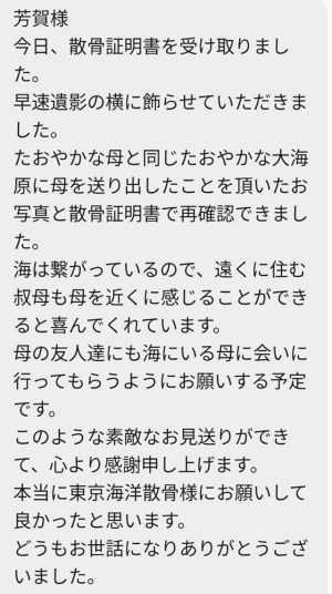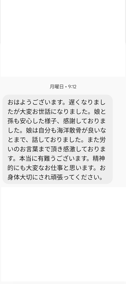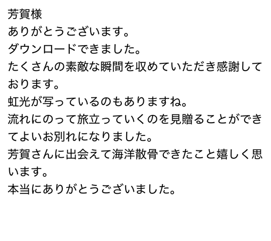 東京海洋散骨が行った散骨へのご感想の一部です。お客様の個人情報に関わる箇所は消しておりますがすべてリアルなご感想です。温かいお言葉、厳しいお言葉、すべてを受け止め今後も海洋散骨を選ばれる方のお役に立てるよう努力して参ります。このように海洋散骨を体験されたお客様の声、評判、口コミ、お叱りを公開することによりお客様が弊社の散骨にならずとも海洋散骨を知っていただくきっかけになれば幸いです。(2026.2現在700レビュー以上)